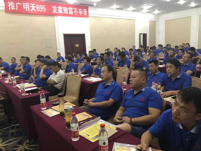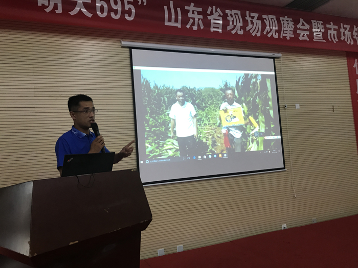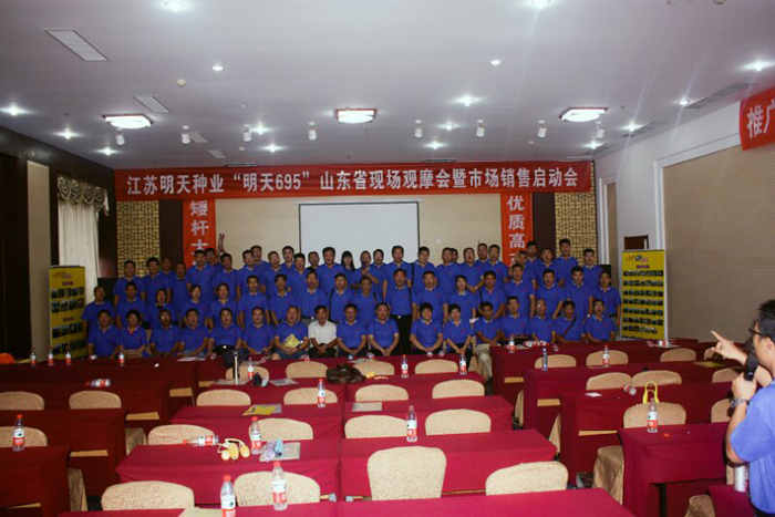 2017年7月29-30日,江蘇明天種業在山東省章丘市組織召開“明天695”山東省級現場觀摩會暨銷售啟動會。“明天695”是江蘇明天種業自主選育的矮桿大穗、抗病耐高溫、優質高產玉米新品種。也是江蘇明天種業進入山東市場第一個玉米品種。通過此次會議的召開,讓來自山東省70多個縣市經銷商到“明天695”玉米展示田進行觀摩和考察。今年7月份前期高溫,后期連續陰雨大風天氣,導致很多地區的玉米田出現倒伏和授粉不良現象,而“明天695”田間沒有一塊倒伏現象,沒有出現高溫熱害現象,結實率很高,同時,田間幾乎看不到任何病害發生。通過田間觀摩,“明天695”以優異表現,得到了經銷商們一致認可。 30日上午室內會議,江蘇明天種業總經理助理孔志榮先生對江蘇明天種業整體情況進行了介紹,并做“江蘇明天種業雜交玉米產業前期發展情況和中長期戰略規劃”主旨報告。讓山東省各縣經銷商對江蘇明天種業有了充分了解,對與江蘇明天種業合作推廣“明天695”充滿信心。公司雜交玉米事業部副經理吳東德針對“明天695”的特征特性和山東各地區示范田表現情況進行了介紹。隨后,通過山東省經銷商代表們的發言可以看出,“明天695”在各區域春、夏播表現十分搶眼,大多經銷商都把“明天695”與當地主栽品種進行了對比種植,通過對比發現,“明天695”在抗倒性、耐高溫能力、抗病性等等方面表現較為突出。