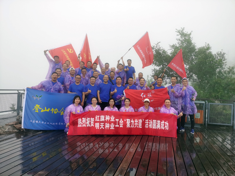 為進(jìn)一步增進(jìn)與兄弟單位的深厚友誼,會(huì)后,雙方工會(huì)開展“聚力共建、攀登紫金”的主題登山活動(dòng)。途中偶遇瓢潑大雨,大家面對(duì)困境,不畏艱辛,互幫互助,堅(jiān)持登頂,共同合影留念。“紅旗明天更美好、明天紅旗更鮮艷”成為響亮的共建口號(hào)。汗水與雨水的融合,完美的詮釋了紅旗種業(yè)、明天種業(yè)的企業(yè)文化,體現(xiàn)出種業(yè)人艱苦奮斗、勇攀高峰的精神面貌。