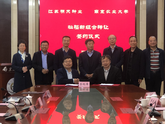南京農業大學副校長丁艷峰、江蘇省種子管理站站長何金龍、江蘇明天種業總經理嚴輝民、南京農業大學研究院院長姜東、農學院院長朱艷、特約教授盛勝蘭研究員、江蘇明天種業副總經理王波、徐江等相關領導、專家參加了此次簽約活動。