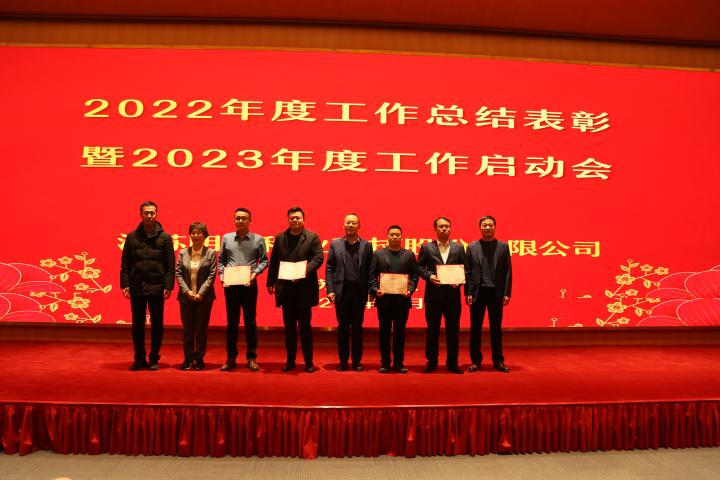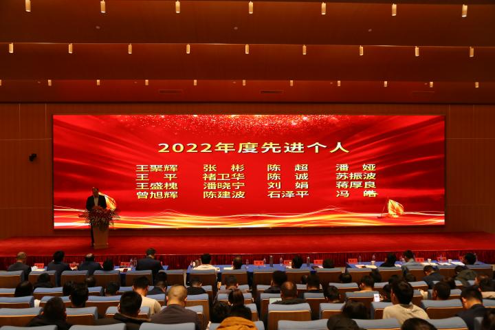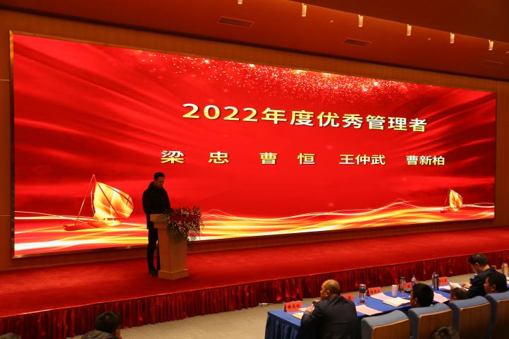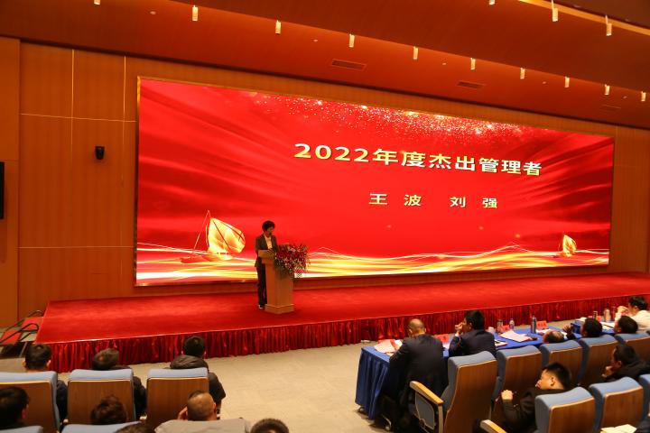 大會第二項議程由公司副總經理王波宣讀關于2022年度先進表彰的決定,由師洪飛、徐江等公司領導宣讀先進集體、杰出管理者、優秀管理者、先進個人先進事跡。